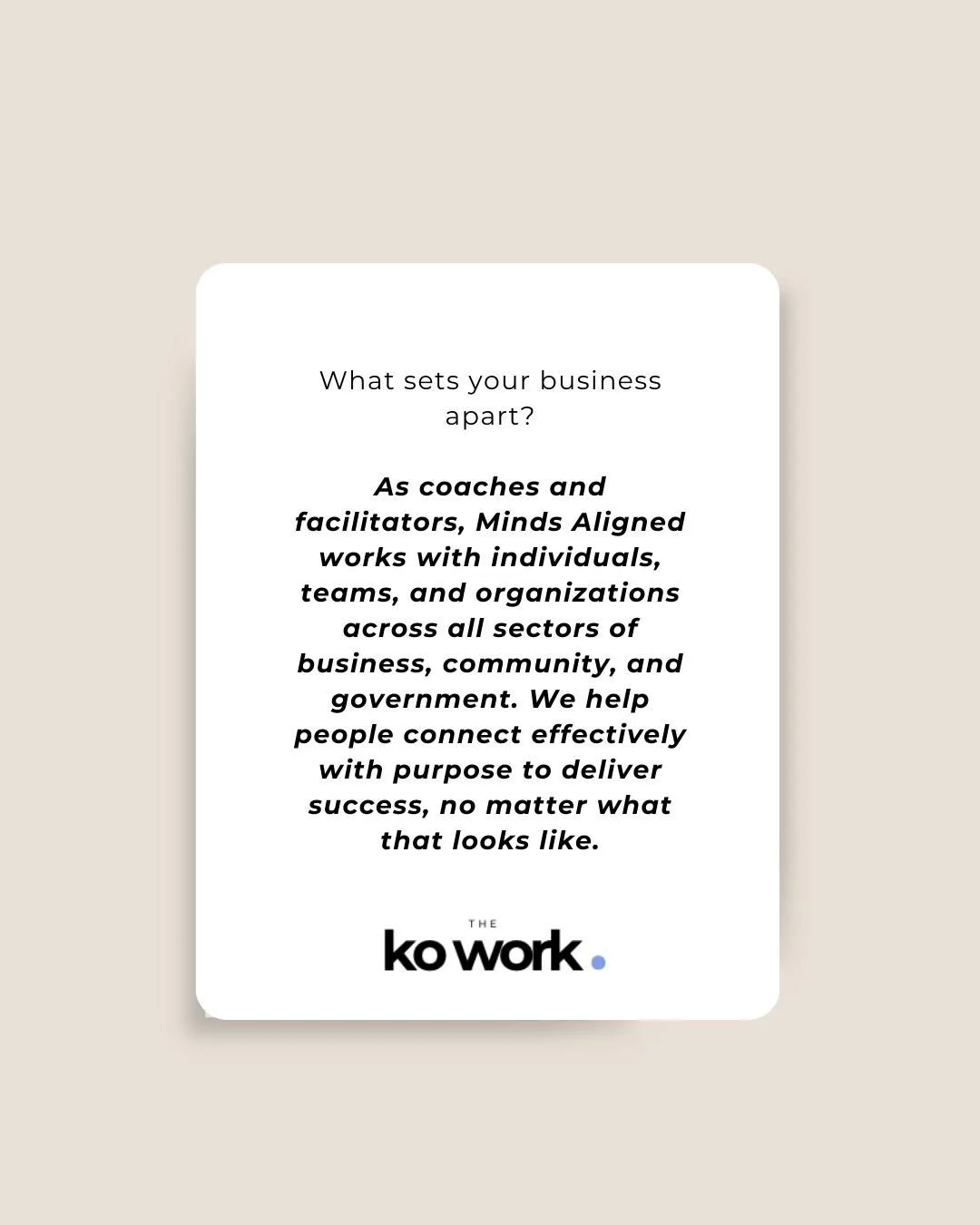Minds Aligned is a coaching and facilitation business that specializes in empowering individuals, teams, and organizations to unlock their true potential. With over 18 years of experience, we work across a variety of sectors—business, community, and government—to help clients gain clarity, connect with purpose, and drive success. Whether you're seeking personal development, team alignment, or strategic business planning, Minds Aligned offers tailored solutions to guide you toward your goals.